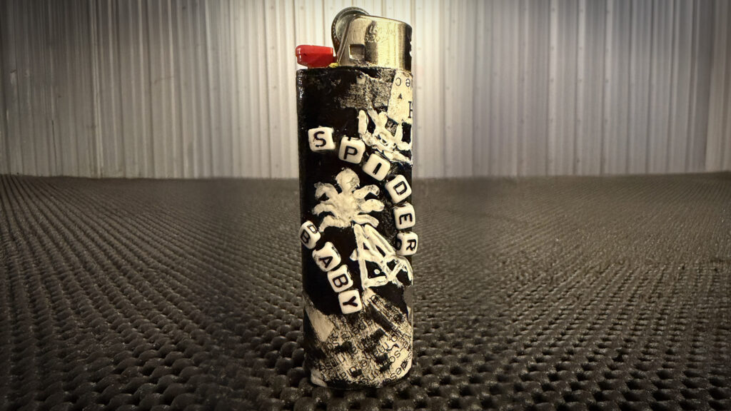 These are our handmade LIGHTERS. Each one requiring hours of band enslaved labor to construct. These one of a kind lighters can only be found at our shows, come see what unique design we make next !